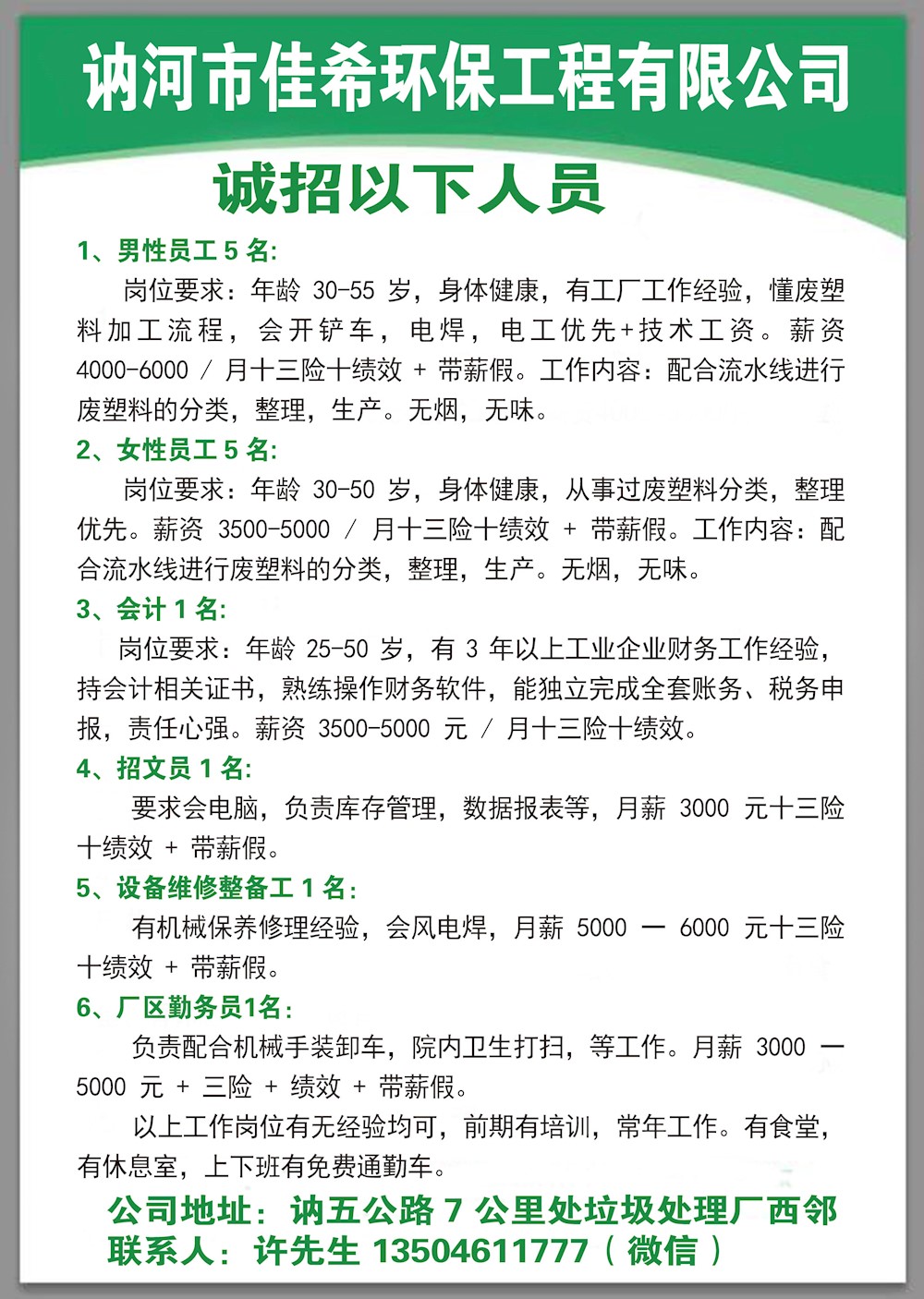 讷河市佳希环保工程有限公司诚聘: