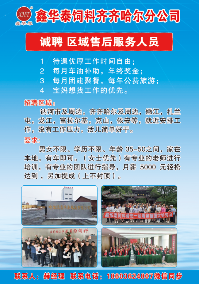鑫华泰饲料齐齐哈尔分公司诚聘区域售后服务人员