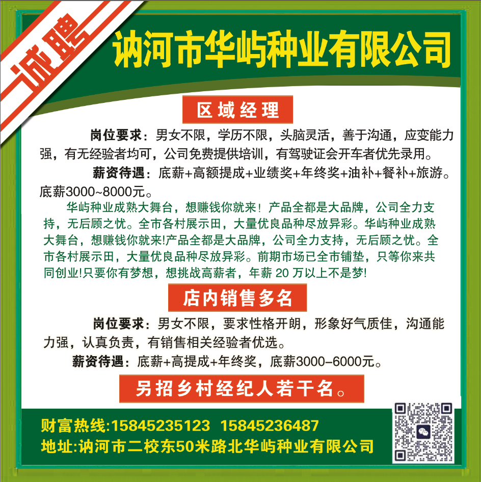 华屿种业成熟大舞台,想赚钱你就来!产品全都是大品牌,公司全力支持,无后顾之忧。全市各村展示田,大量优良品种尽放异彩。前期市场已全市铺垫,只等你来共同创业!只要你有梦想,想挑战高薪者,年薪20万以上不是梦!