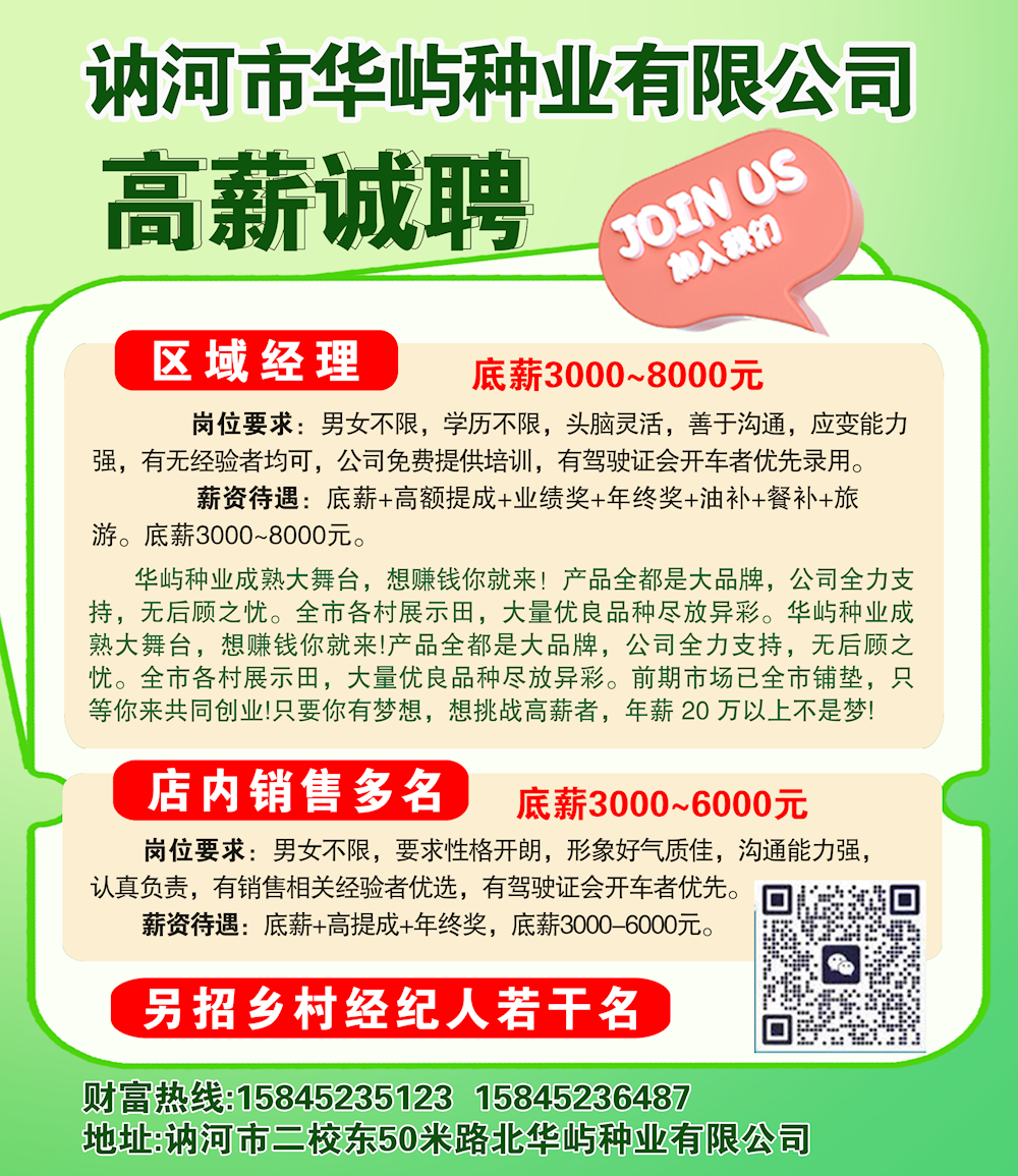 华屿种业成熟大舞台,想赚钱你就来!产品全都是大品牌,公司全力支持,无后顾之忧。全市各村展示田,大量优良品种尽放异彩。华屿种业成熟大舞台,想赚钱你就来!产品全都是大品牌,公司全力支持,无后顾之忧。全市各村展示田,大量优良品种尽放异彩。前期市场已全市铺垫,只等你来共同创业!只要你有梦想,想挑战高薪者,年薪 20 万以上不是梦!