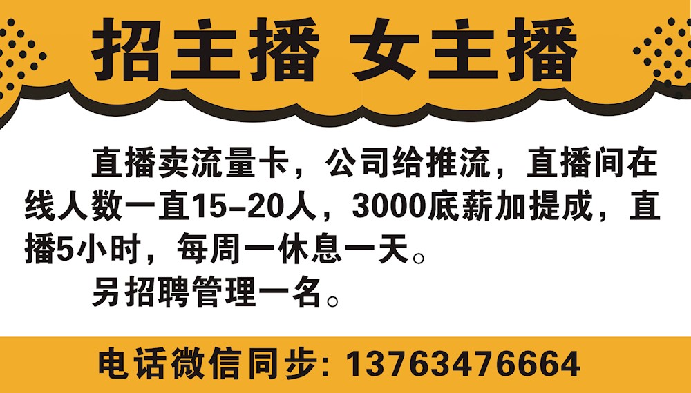 招主播,女主播,不露脸,直播卖流量卡,公司给推流,直播间在线人数一直15-20人,3000底薪加提成,直播5小时,每周一休息一天。另招聘管理一名。