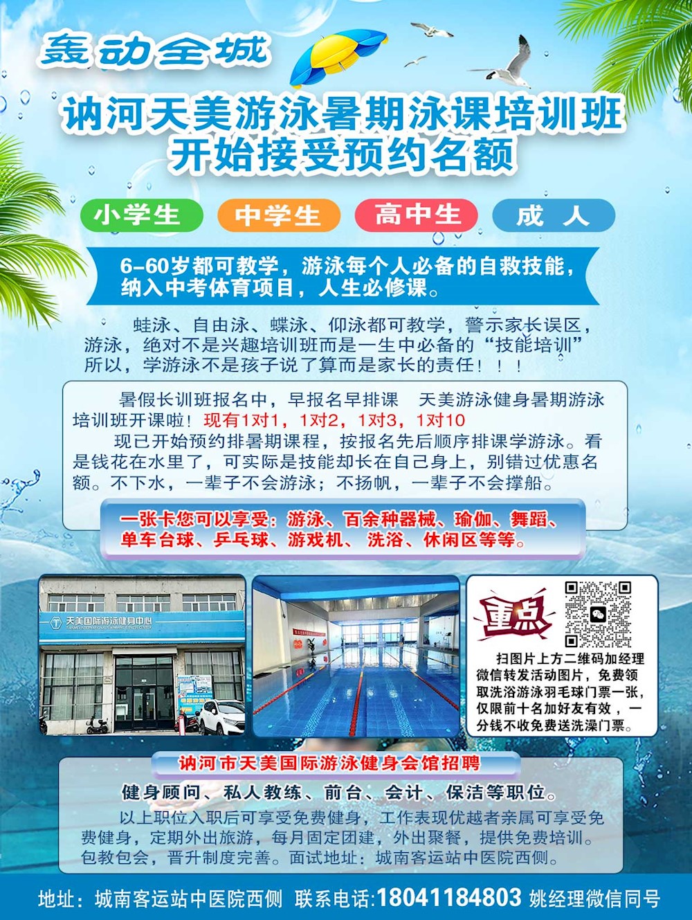 小学生、中学生、高中生、成人,6-60岁都可教学,游泳每个人必备的自救技能, 纳入中考体育项目,人生必修课。