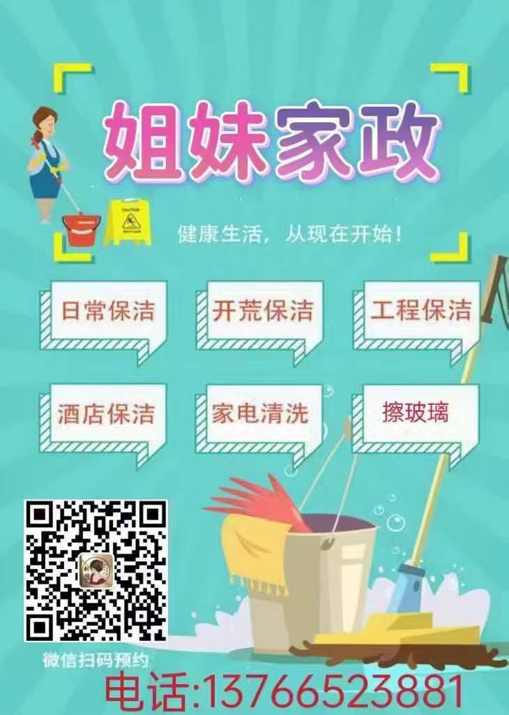 姐妹家政:承接新楼开荒,旧楼保洁,擦玻璃(配有安全绳)。包月或分次打扫,各种家政零活,清洗吸油烟机,保证质量,包您满意,随叫随到。