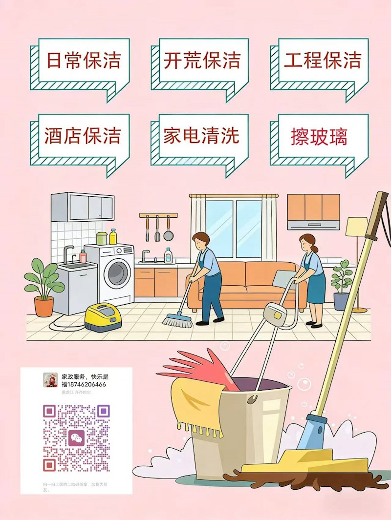 洁美家政:承接住家,单位楼房开荒,清理,短期,长期房屋清理,新旧楼保洁,宾馆,店面打扫,房屋归纳整理专业擦玻璃,搬家,清洁整理,窗帘沙发清洗。各种室外零活。讷河,莫齐,乡下民房,均可接单另长年接做饭单,护工单,育婴单🌹🌹🌹15946282190 13242538999