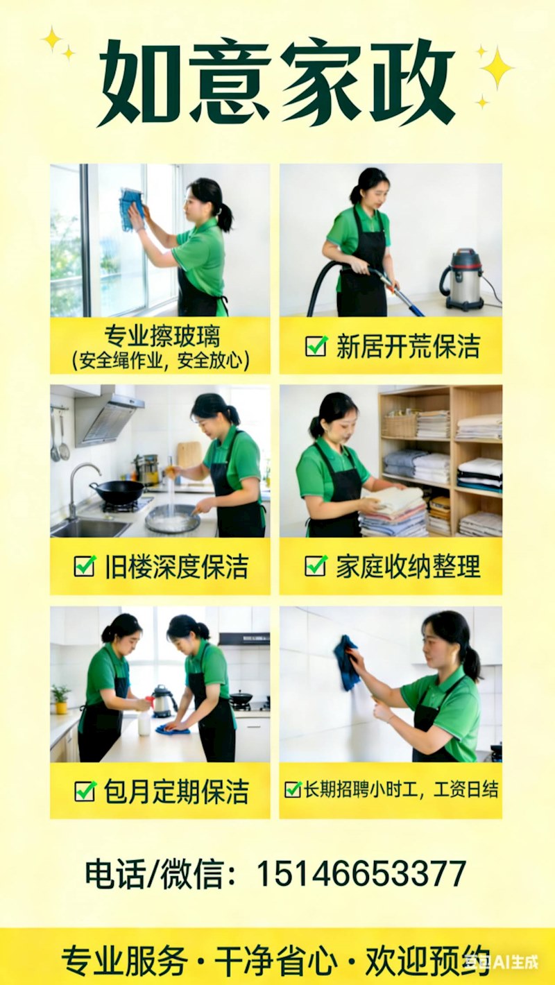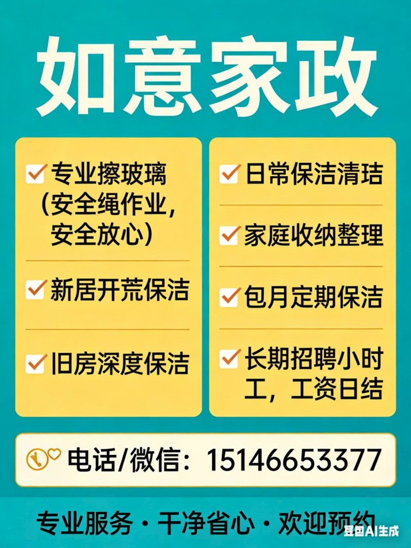 如意家政✅ 专业擦玻璃(安全绳作业,安全放心)✅ 新居开荒保洁✅ 旧房深度保洁✅ 日常保洁清理✅ 家庭收纳整理✅ 包月定期保洁✅ 长期招聘小时工,工资日结☎️ 电话/微信:15146653377专业服务 · 干净省心 · 欢迎预约