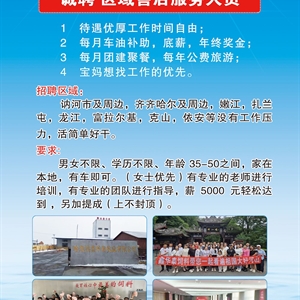 要求:男女不限、学历不限、年龄 35-50之间,家在本地,有车即可。(女士优先)有专业的老师进行培训,有专业的团队进行指导,🈷️薪 5000 元轻松达到 ,另加提成(上不封顶)