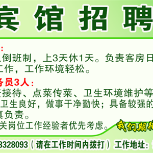 避风塘主题宾馆招宾馆吧员2名,工作清闲,不需要打扫厅堂卫生,不查房,要求有一定的语言沟通能力,会使用电脑,能长期工作者优先!招宾馆保洁员2名,要求女性35-55周岁,就近上班能长期工作者优先。招聘股东经理1名,欢迎您的加入电话/微信:18645219765