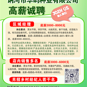 华屿种业成熟大舞台,想赚钱你就来!产品全都是大品牌,公司全力支持,无后顾之忧。全市各村展示田,大量优良品种尽放异彩。华屿种业成熟大舞台,想赚钱你就来!产品全都是大品牌,公司全力支持,无后顾之忧。全市各村展示田,大量优良品种尽放异彩。前期市场已全市铺垫,只等你来共同创业!只要你有梦想,想挑战高薪者,年薪 20 万以上不是梦! 二、店内销售多名