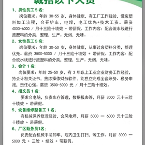 1、男性员工 5 名: 岗位要求:年龄 30-55 岁,身体健康,有工厂工作经验,懂废塑料加工流程,会开铲车,电焊,电工优先+技术工资。薪资 4000-6000 / 月十三险十绩效 + 带薪假。工作内容:配合流水线进行废塑料的分类,整理,生产。无烟,无味。 2、女性员工 5 名: 岗位要求:年龄 30-50 岁,身体健康,从事过废塑料分类,整理优先。薪资 3500-5000 / 月十三险十绩效 + 带薪假。工作内容:配合流水线进行废塑料的分类,整理,生产。无烟,无味。 3、会计 1 名: 岗位要求:年龄 25-50 岁,有 3 年以上工业企业财务工作经验,持会计相关证书,熟练操作财务软件,能独立完成全套账务、税务申报,责任心强。薪资 3500-5000 元 / 月十三险十绩效。 4、招文员 1 名: 要求会电脑,负责库存管理,数据报表等,月薪 3000 元十三险十绩效 + 带薪假。 5、设备维修整备工 1 名: 有机械保养修理经验,会风电焊,月薪 5000 一 6000 元十三险十绩效 + 带薪假。 6、厂区勤务员1名: 负责配合机械手装卸车,院内卫生打扫,等工作。月薪 3000 一 5000 元 + 三险 + 绩效 + 带薪假。 以上工作岗位有无经验均可,前期有培训,常年工作。有食堂,有休息室,上下班有免费通勤车。